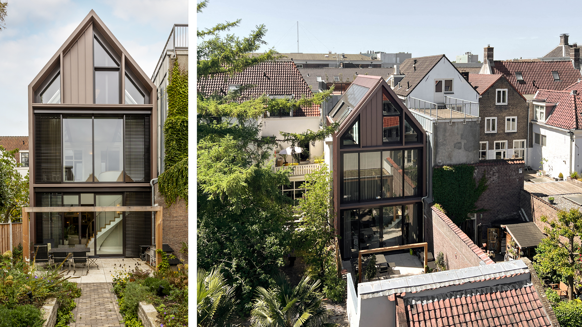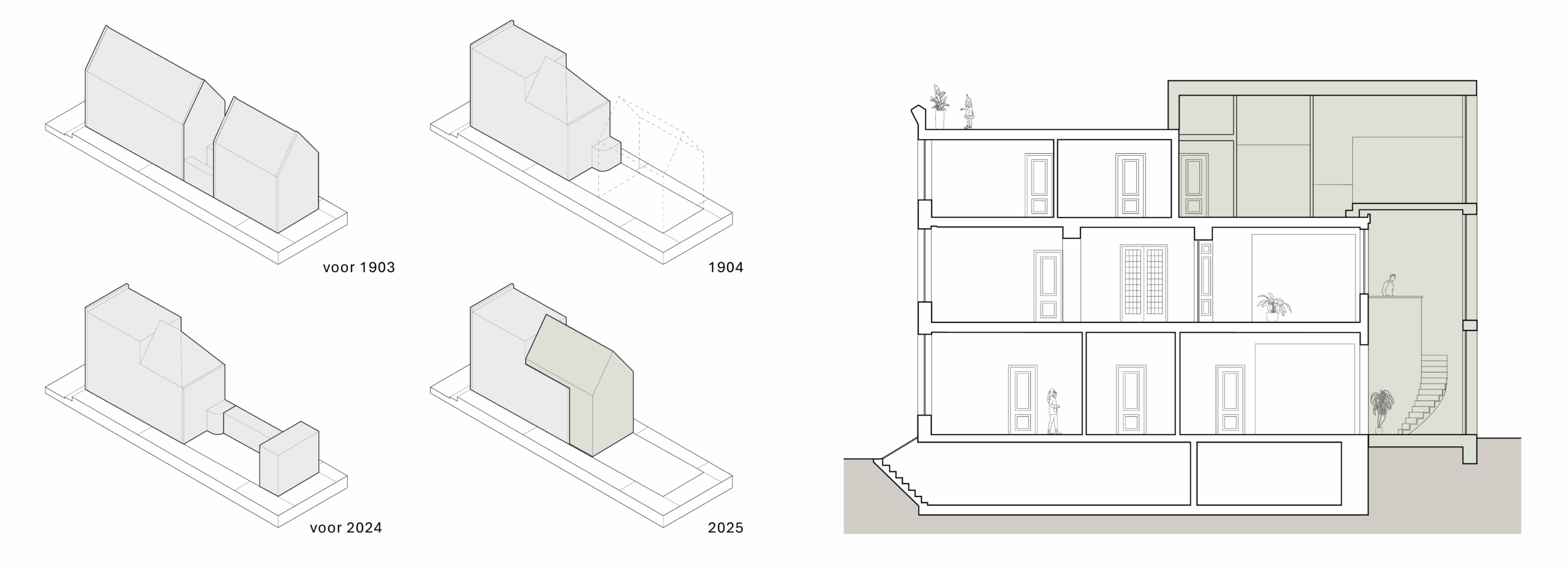 De drie verdiepingen hoge aanbouw vormt een ruimtelijk en verbindend element aan de achterzijde, precies op de plek van de voormalige patio. De hoogte versterkt de aanwezigheid van de historische achtergevel. Door hier bewust een eigentijdse toevoeging te maken, in zowel materiaal als vorm, blijven de historische structuur en de verschillende bouwfases helder afleesbaar.