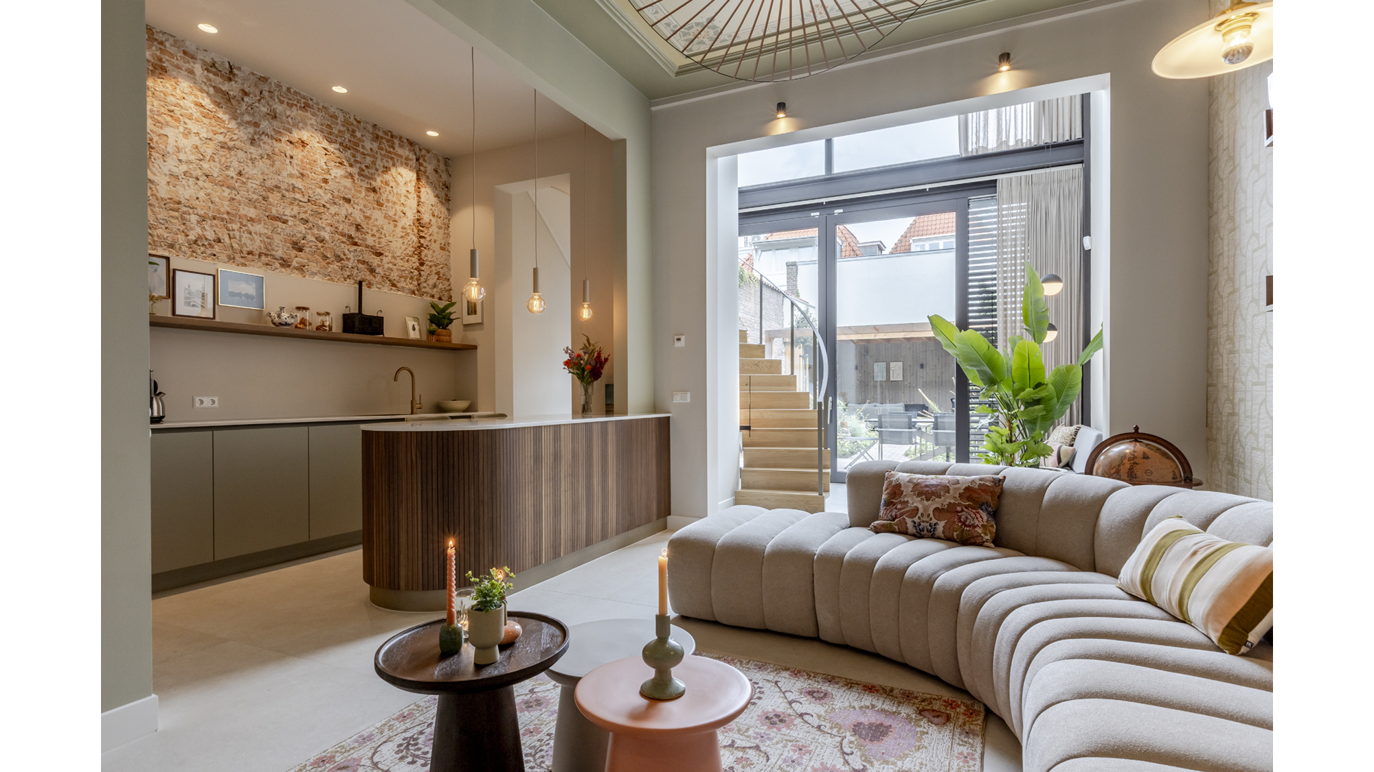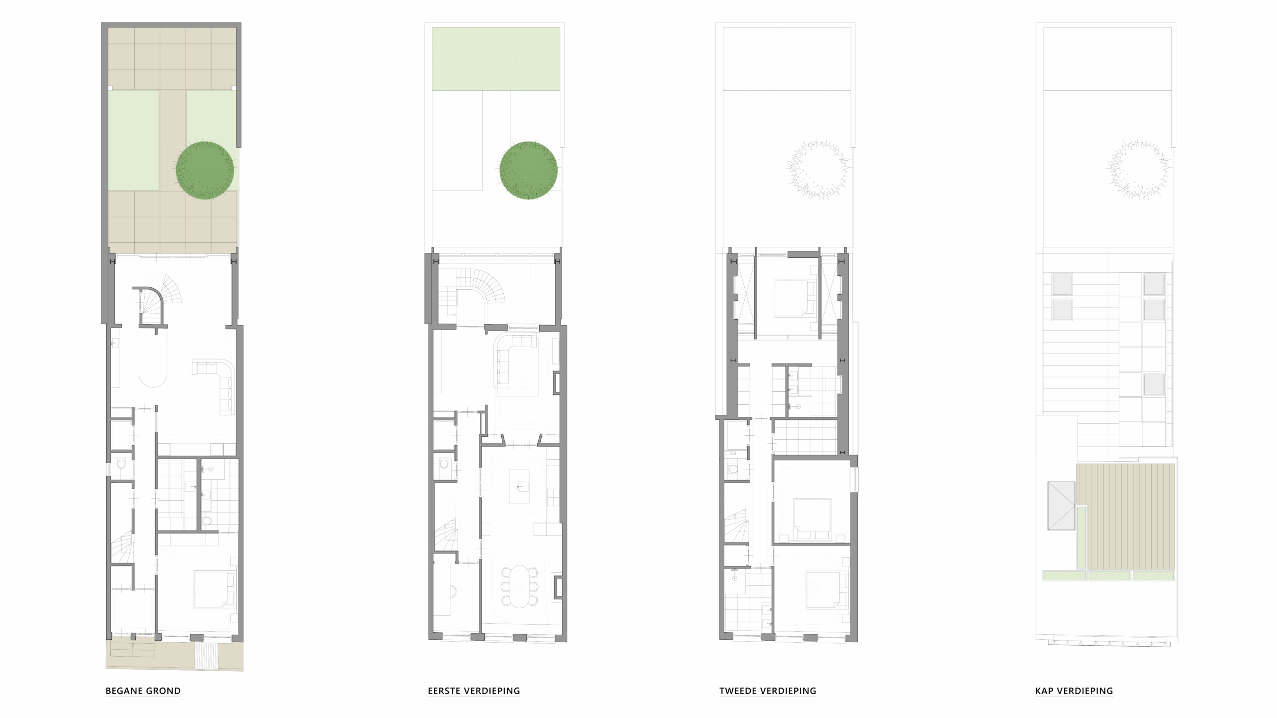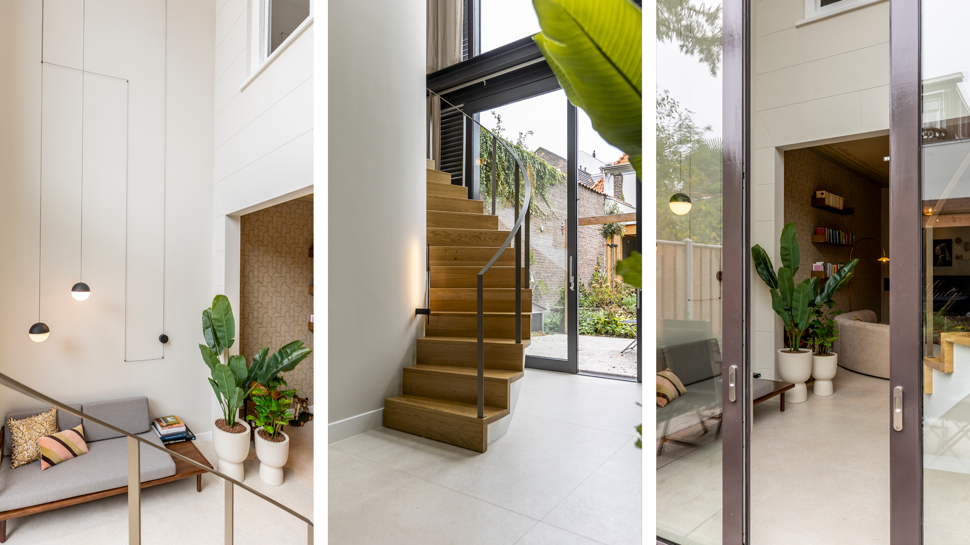 Hier ontwerpen we een pandhoge aanbouw waarin het karakter en de ruimtelijkheid van de oude patio opnieuw voelbaar worden. Deze zone is een ruimtelijk verbindend element tussen de woonruimtes van de begane grond en eerste verdieping. - De zone van het voormalige achterhuis en de tuin