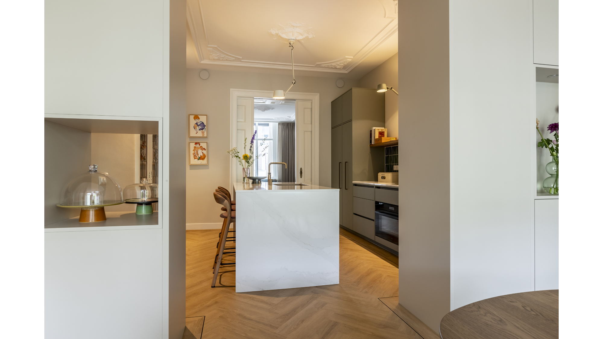 Op de eerste verdieping is de woonverdieping gerealiseerd. Binnen de aanwezige ornamentenplafonds ontwierpen we een moderne ensuite-kast die de verschillende ruimtes definieert én verbindt. Het dakterras op het platte dak aan de voorzijde, evenals de toegang daartoe, is verbeterd.